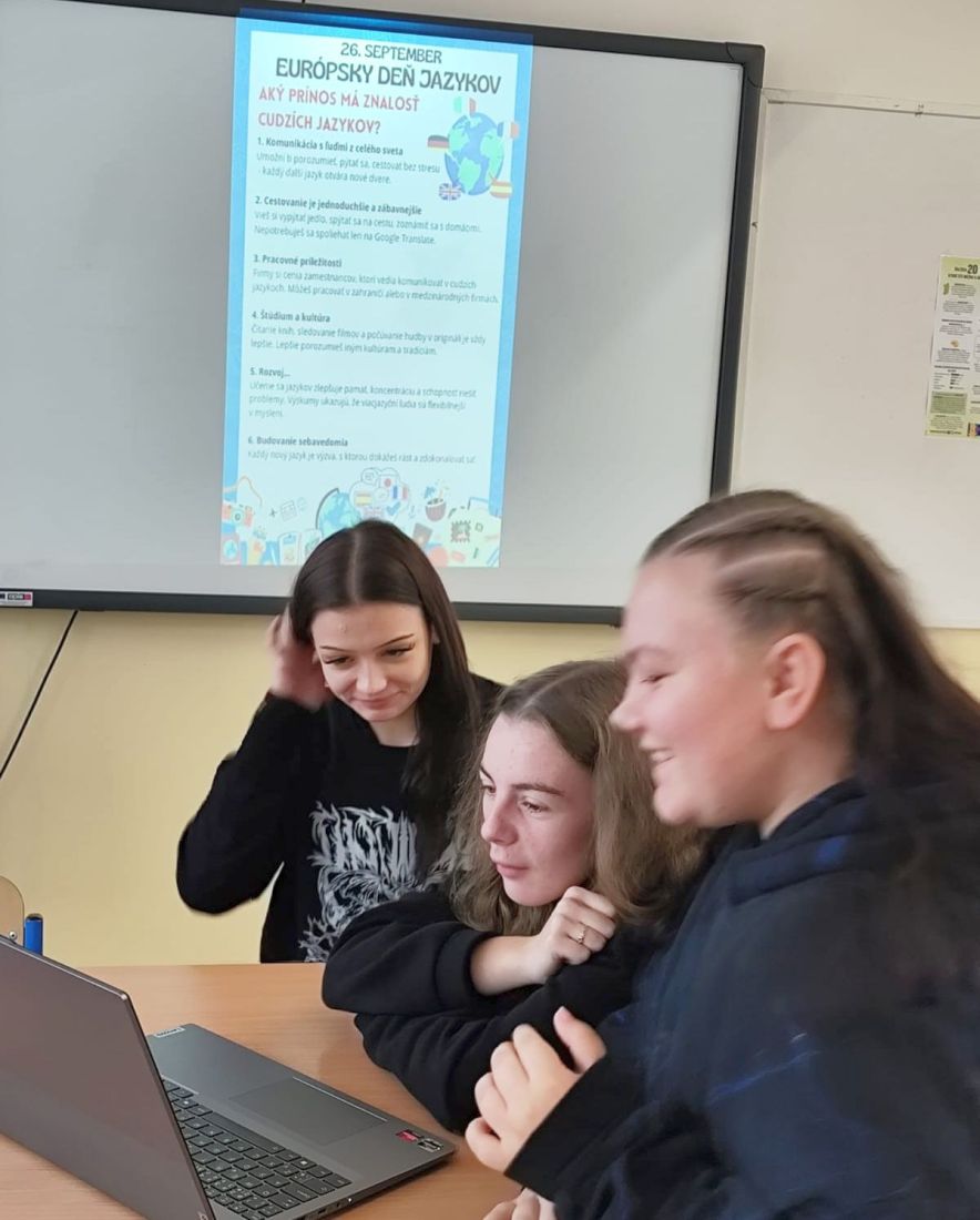 Európsky deň jazykov, ktorý bol prvýkrát vyhlásený z iniciatívy Rady Európy v roku 2001 sa každoročne oslavuje 26. septembra. Cieľom je poukázať na význam učenia sa jazykov a podporiť medzikultúrne porozumenie. V tento deň sme si aj my pripomenuli dôležitosť jazykového vzdelávania a učiteľky anglického jazyka pri tejto príležitosti zorganizovali pre študentov zaujímavé aktivity. Žiaci 1. a 3. ročníka si mali možnosť zasúťažiť a zábavnou formou overiť svoje vedomosti, ako aj dozvedieť sa nové informácie formou kvízov a edukačných hier. Strávili sme tak príjemné a podnetné piatkové dopoludnie poznávaním bohatého jazykového a kultúr-neho dedičstva nášho kontinentu.
